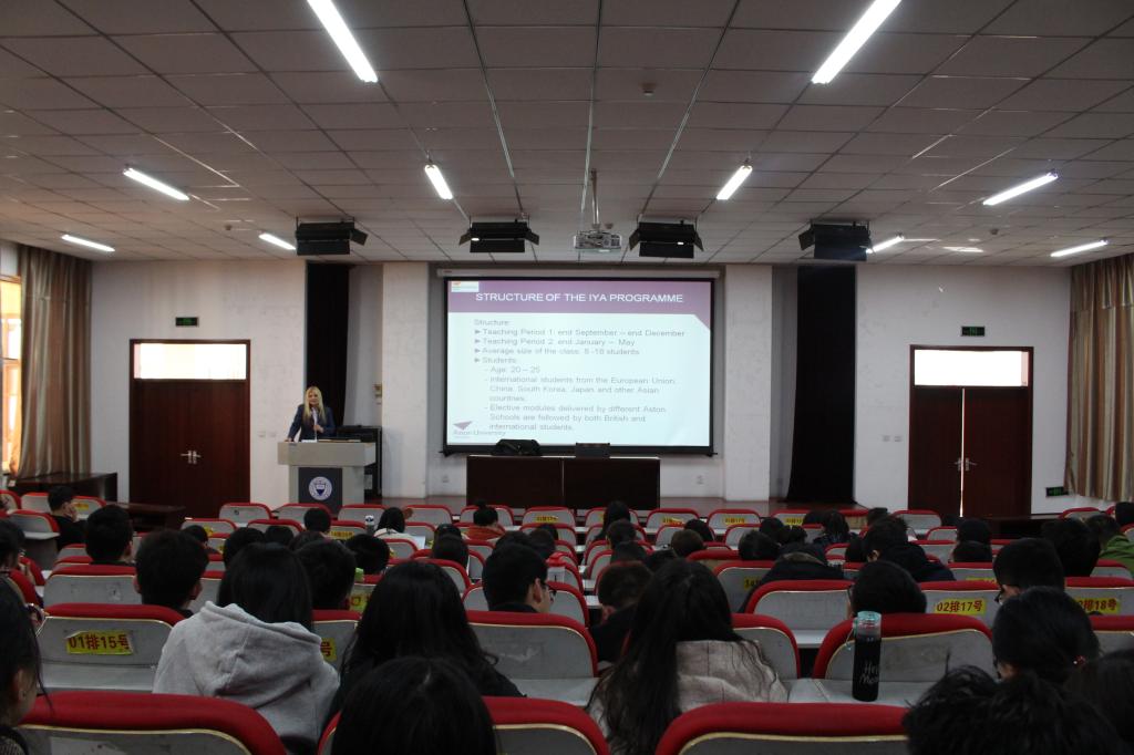 随后,主讲人、阿斯顿大学负责国际合作事务的Dr.Branka Visnjic对IYA这一长期项目进行了详细介绍。她指出了这一项目的特别之处,强调了IYA项目给员工带来的好处,还介绍了此项目所针对的对象、费用、需求以及申请等方面的内容。此项目的学习分为核心模块、选修模块和社会计划体验式学习三个模块,同时,也会安排不同的授课结构和学业检测考试。另外,还穿插介绍了阿斯顿大学的地理位置、气候条件、周边环境和住宿等相关情况。