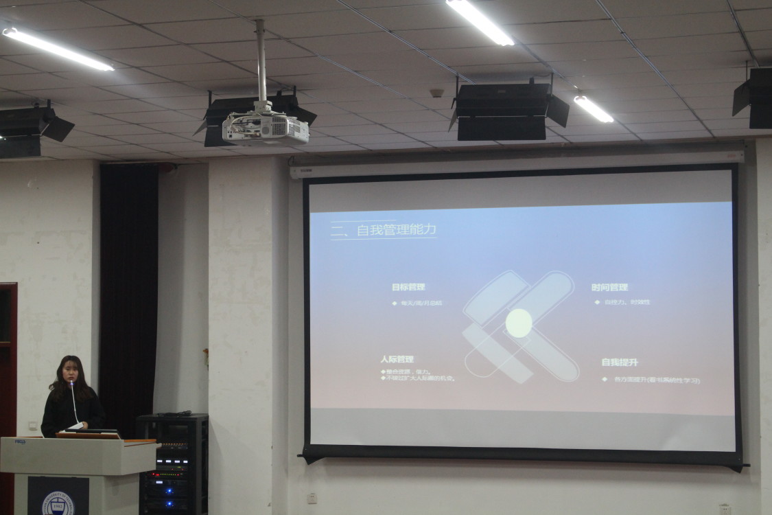 市营1502侯莹先向大家整体介绍了自己大学四年的学习、比赛及团学工作经历。接着,她指出,在团队管理中要注意建立信任、目标导向、项目流程、共同承诺以及高效沟通这五个方面。在目标管理、人际管理、时间管理以及自我提升这四个方面进行自我管理的提升。最后,她建议大家在四年的老员工活中,多实习,找资源,多参赛,广学习。