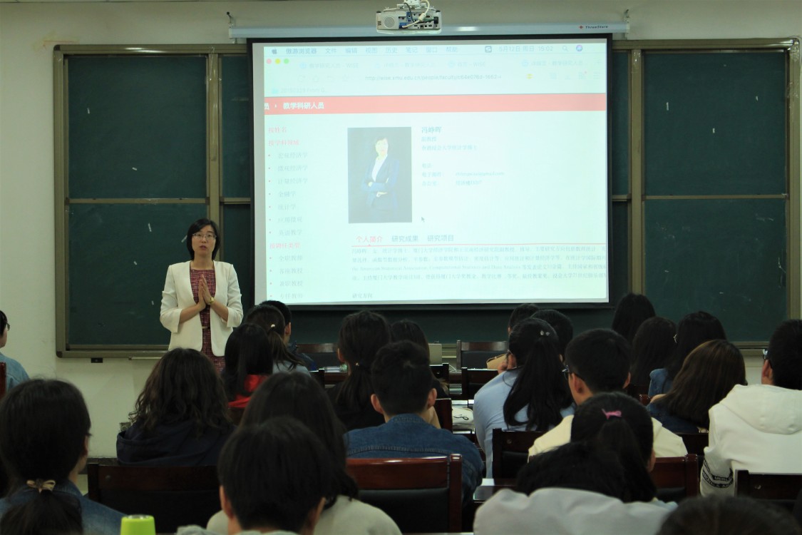 首先,冯峥晖对厦门大学经济学科做了简单的介绍,厦门大学经济学领域的公司及研究单位包括,经济公司、王亚南经济研究院以及邹至庄经济研究中心。随后,她主要就教学评估、教学科研单位、团队建设、团队力量、培养理念、目标、特色等多方面内容,对经济公司及两个研究单位进行了详细介绍。接着,她向大家说明了厦门大学经济学科博士生、直博生以及研究生的招生方式、招生时间、考核方式、招生专业、招生考试科目以及学制与奖助学金等方面的内容。此外,她还播放了厦门大学的简介影像视频,使大家对厦门大学的办学理念与教学环境有了更深刻的印象。