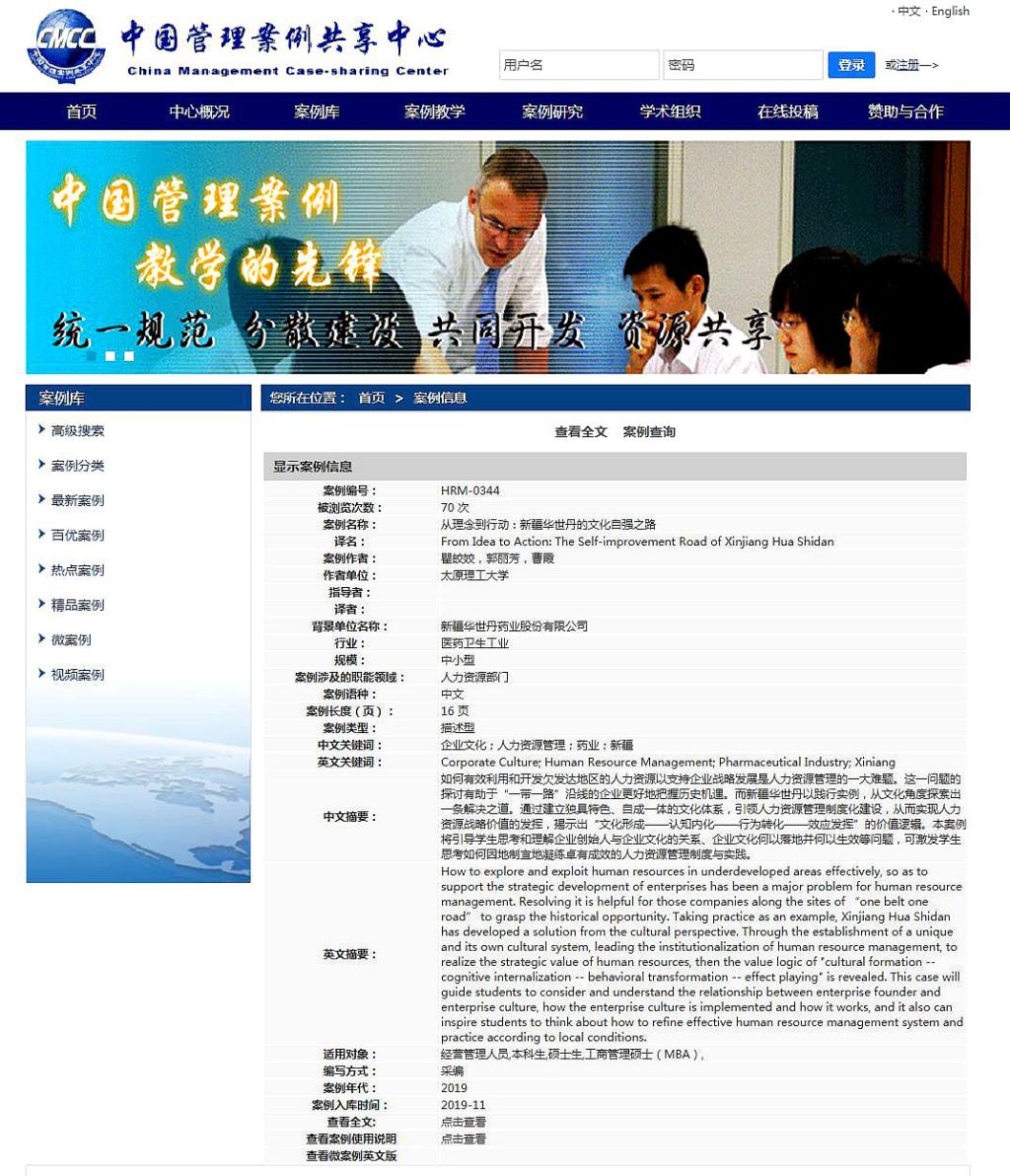近日,从中国管理案例共享中心案例库传来喜讯,公司suncitygroup太阳集团教师瞿皎姣、郭丽芳撰写的案例《从理念到行动:新疆华世丹的文化自强之路》被该案例库收录。这也是继去年之后,公司教师撰写的管理案例再次入库中国管理案例共享中心,将为公司及全国相关兄弟院校《人力资源管理》课程教学提供更丰富、更专业的案例教学范本。