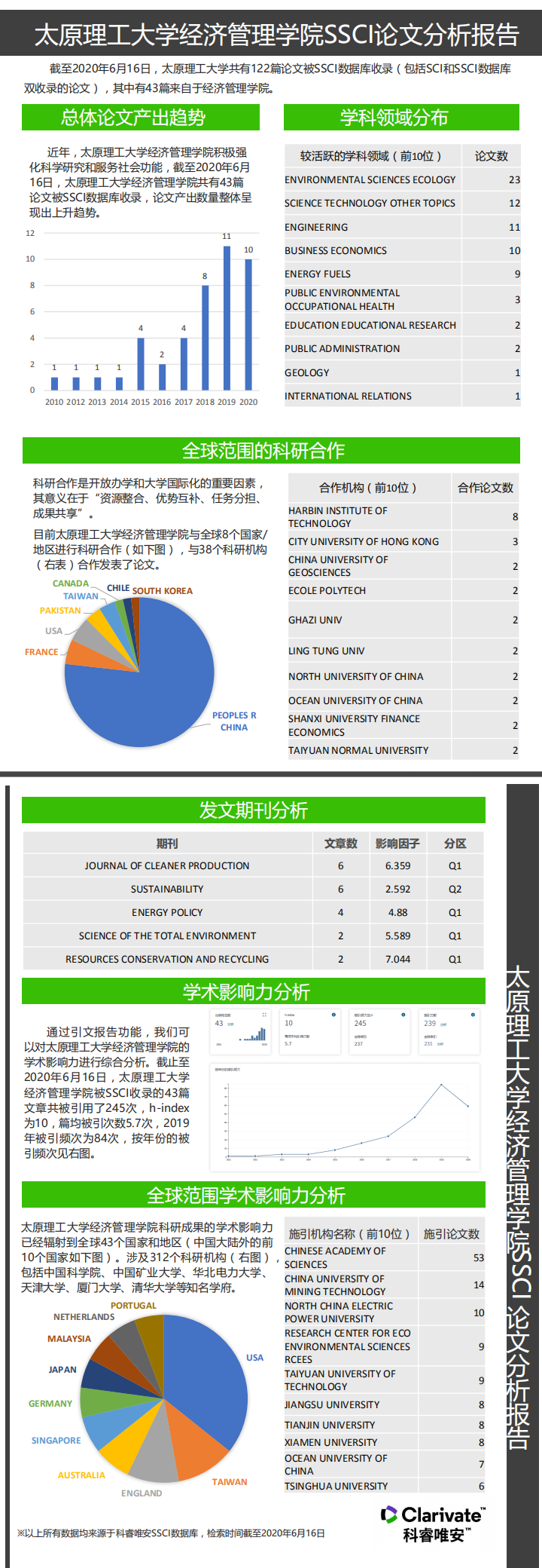 通过报告分析,截至2020年6月16日,公司共有122篇论文被SSCI数据库收录(包括SCI和SSCI数据库双收录的论文),其中有43篇来自于suncitygroup太阳集团,占比为35.25%,发文较活跃的学科为:生态环境学、工程学、商业经济学、能源燃料等方面,呈现出较高的学科交叉融合的态势。