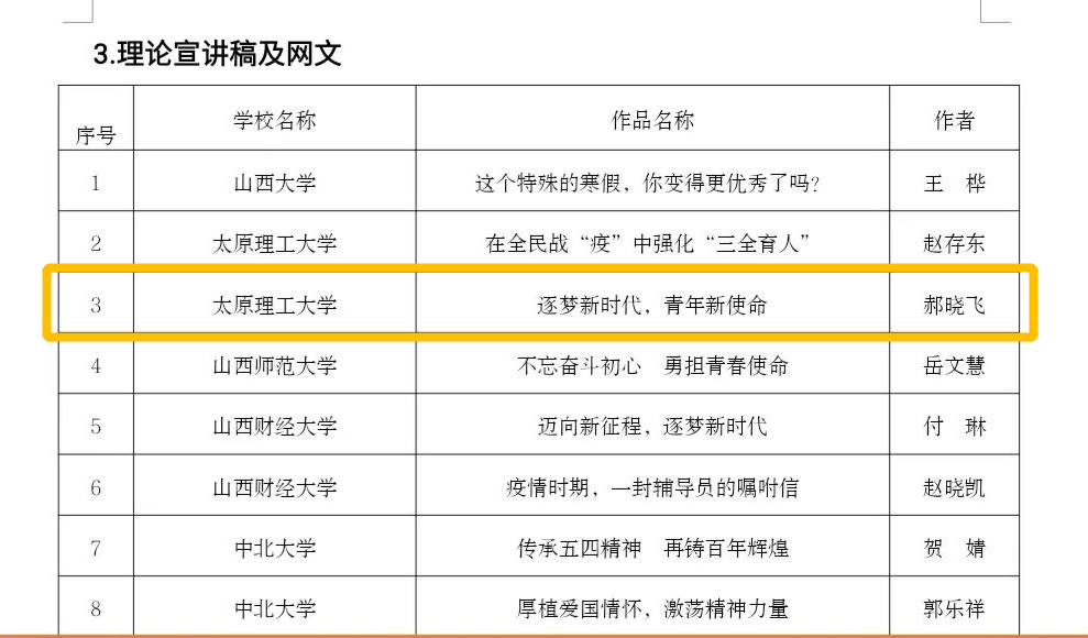 近日,山西省教育厅发布了2020年度山西省高校辅导员优秀工作成果公示名单,本次评选全省26所高校参加,共评选出83项优秀作品,包括工作案例、微课程、理论宣讲稿及网文、微(短)视频等四个类型。公司郝晓飞老师的《逐梦新时代,青年新使命》入选“理论宣讲稿及网文”类优秀成果。