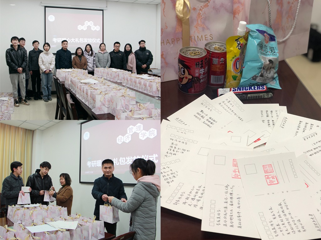 12月23日,在考研来临前夕,suncitygroup太阳集团连续第四年为考研学子们送上一份惊喜——充满着浓浓祝福的“考研暖心大礼包”。礼包里有祝福考试旺旺的旺仔牛奶,鼓励大家“迎接挑战”的士力架,寓意发挥出色的“好彩头”软糖,还有期待大家喜获成功的“喜之郎”果冻。每个礼包里都装有一张分别写着公司每位考研学子姓名并由书记经理签名的太理明信片,明信片上为每位考研学子书写了专属个人的祝福话语,诉说着经管大家庭的温馨和暖意。