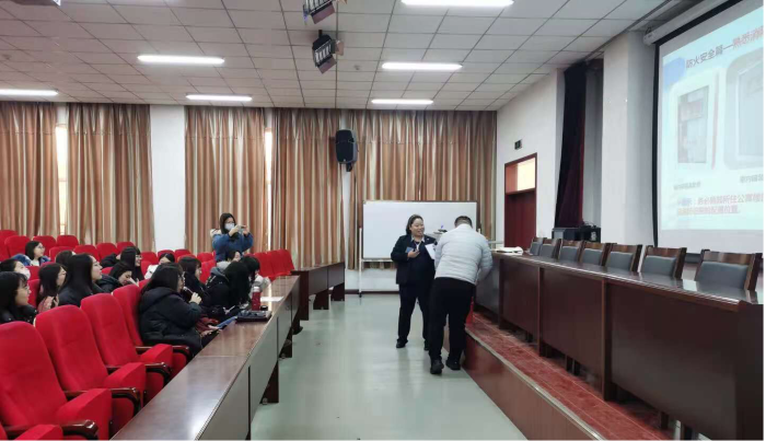 主讲人关丽首先从消防安全角度出发向同学们列举了宿舍存在的火灾隐患,接着穿插消防安全相关视频,向同学们传授预防火灾的方法,分享灭火小妙招以及火灾逃生的经验,并邀请现场同学参与演示如何使用灭火器。