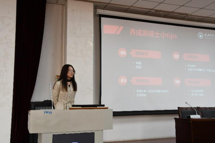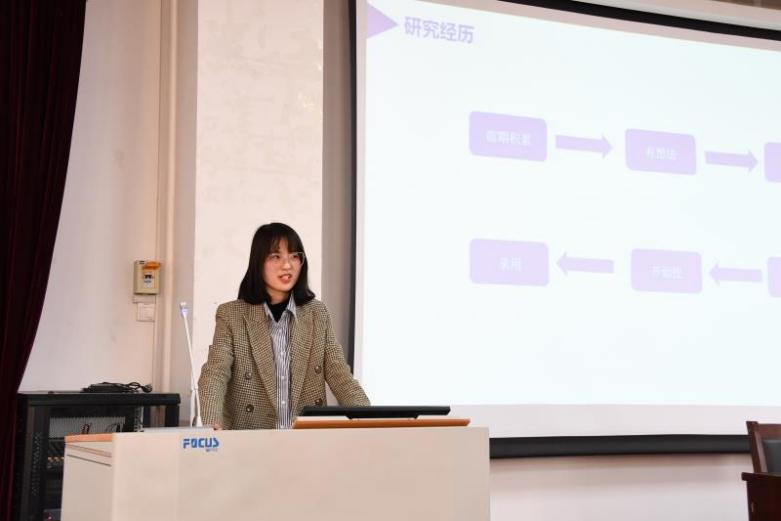 首先上场的是2018级管理科学与工程专业的的雷海涛同学。研究生期间,她发表了2篇SCI论文,参与了两项项目调研,并且多次参加专业相关学术会议。她分享了自己丰富的科研经历与科研方法,强调了“主动与沉淀”在科研过程中的重要性。建议大家从容面对未知领域,克服惰性,主动参加课题汇报和项目调研,戒骄戒躁,厚积薄发。