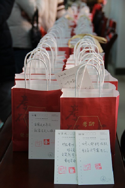 在院团委书记郝晓飞老师的指导下,公司团学组织从半月前便开始筹备此事,从方案、选材、订购直到撰写贺卡、装袋,还有场地布置,低年级的学弟学妹们用辛勤劳动向即将走上考场的学长学姐们传递出了一份份情谊,一份份祝福,也传递了进取的信心和向上的动力。