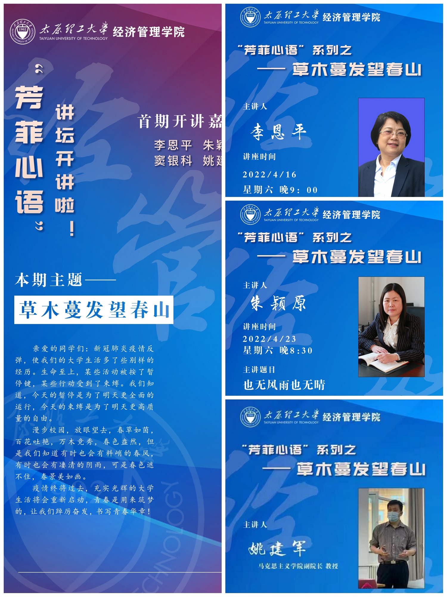 4—5月,在因疫情公司封闭管理期间,为丰富在校员工的公司生活,缓解员工封闭期间的负面情绪,同时喜迎120周年校庆的到来,公司举办“芳菲心雨”系列讲坛之——“草木蔓发望春山”专题,讲坛邀请到公司四位深受员工喜爱的重量级教授,为经管学子在抗疫关键时期奉献上精神和学识的“饕餮盛宴”。